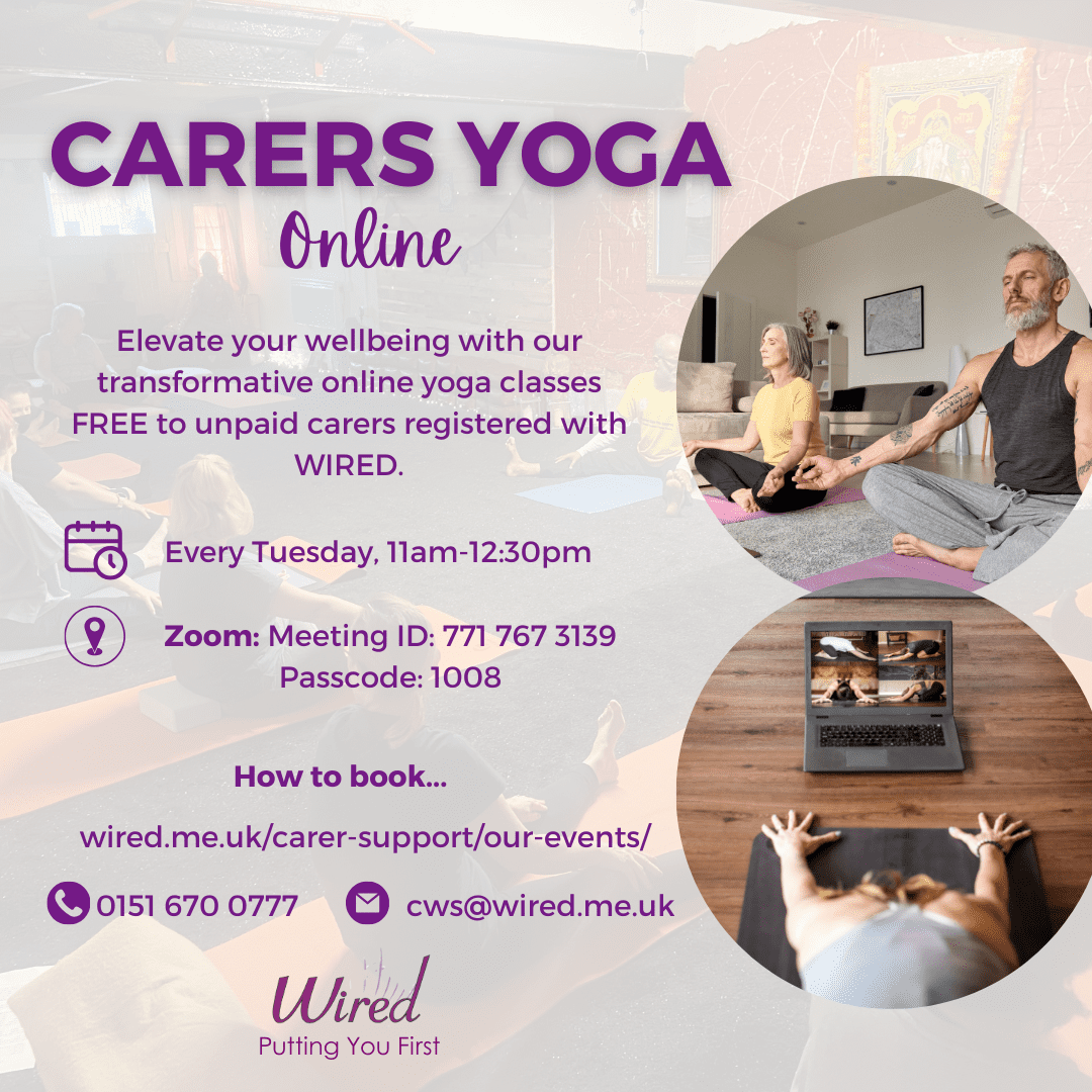 More information: Elevate your wellbeing with our transformative online yoga classes FREE to unpaid carers registered with WIRED. A Zoom link will be sent out once your space has been confirmed.